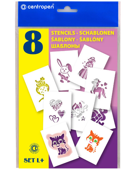 Centropen Set L+ papírové šablony pro foukací fixy vhodné jak pro foukací fixy na textil, tak i pro foukací fixy na papír. Sada obsahuje 8 kvalitních šablon formátu A5 s motivy, které ocení zejména holčičky. Kód produktu: 138113.