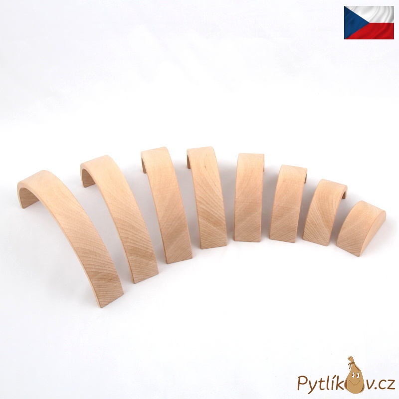 Dřevěné oblouky symbolizující duhu. Balanční a stavební dřevěná přírodní hračka z buku pocházejícího z Beskyd.
