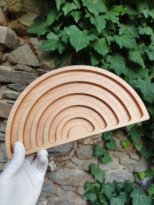 Grafomotorická hračka - smyslová hra pro děti pro rozvoj motorických schopnosti. Dřevěná ručně vyráběná dekorace Duha malá od českého výrobce Dřevokaz. Bukové dřevo s impregnací Osmo, cca 23 x 12, drážka šíře 1,2 cm.