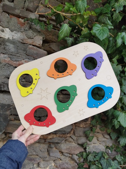 Montessori aktivity pro děti - naučná hra pro děti pro trénování motoriky a paměti. Dřevěná motorická hra Dřevokaz Vkládací třídící deska - UFO. Součástí je 12 ks nabarvených vkládacích koleček (2ks od každé barvy).