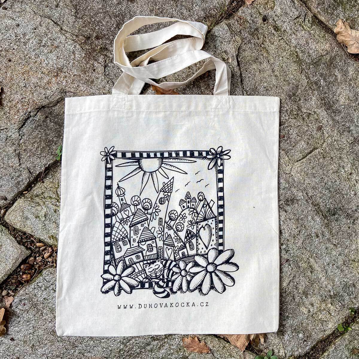 Bavlněná ekotaška na nákup k domalování s veselým obrázkem. Nákupní taška ECO od české výtvarnice Lucie Ernestové. Duhová kočka Ekotaška – Domečky. Rozměr tašky je 38 x 42 cm.