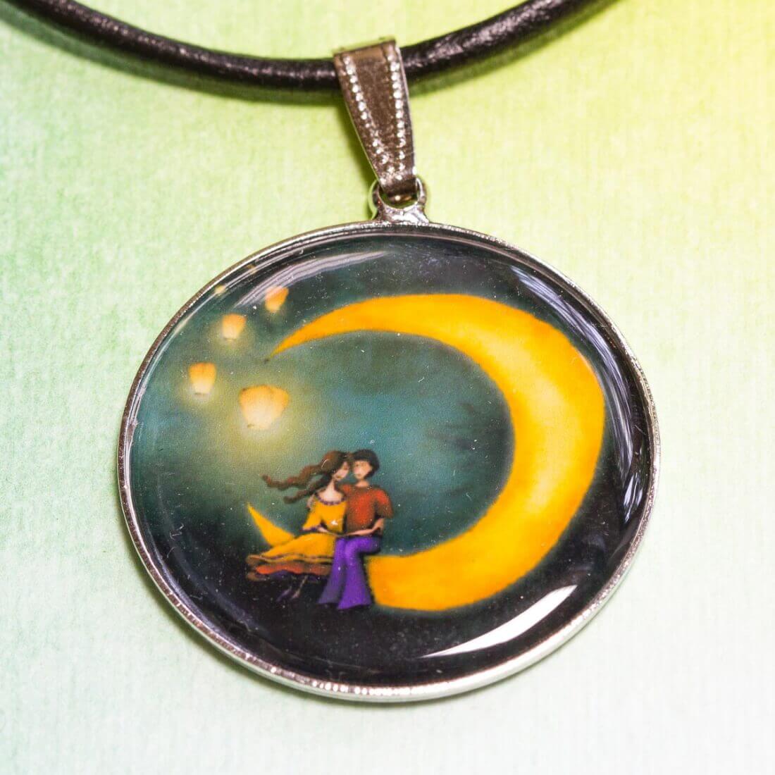 Náhrdelník tvořený kovovým lůžkem průměru 32 mm a čočkou z křišťálové pryskyřice. Čočka s obrázkem má průměr 30 mm. Přívěsek je zavěšený na kožené kulaté šňůrce o průměru 3 mm, s nastavitelnou délkou.