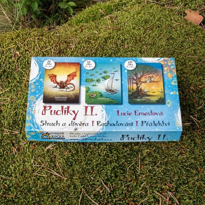 Nádherná dárková sada pro ženy obsahující 3 puzzle - obrázky různé náročnosti (20, 60 a 130 dílků). Duhová kočka Puclíky II. ilustrace od výtvarnice Lucie Ernestové. Obrázek Strach a důvěra, Rozhodnutí nebo Přátelství jistě potěší nejednu dušičku.