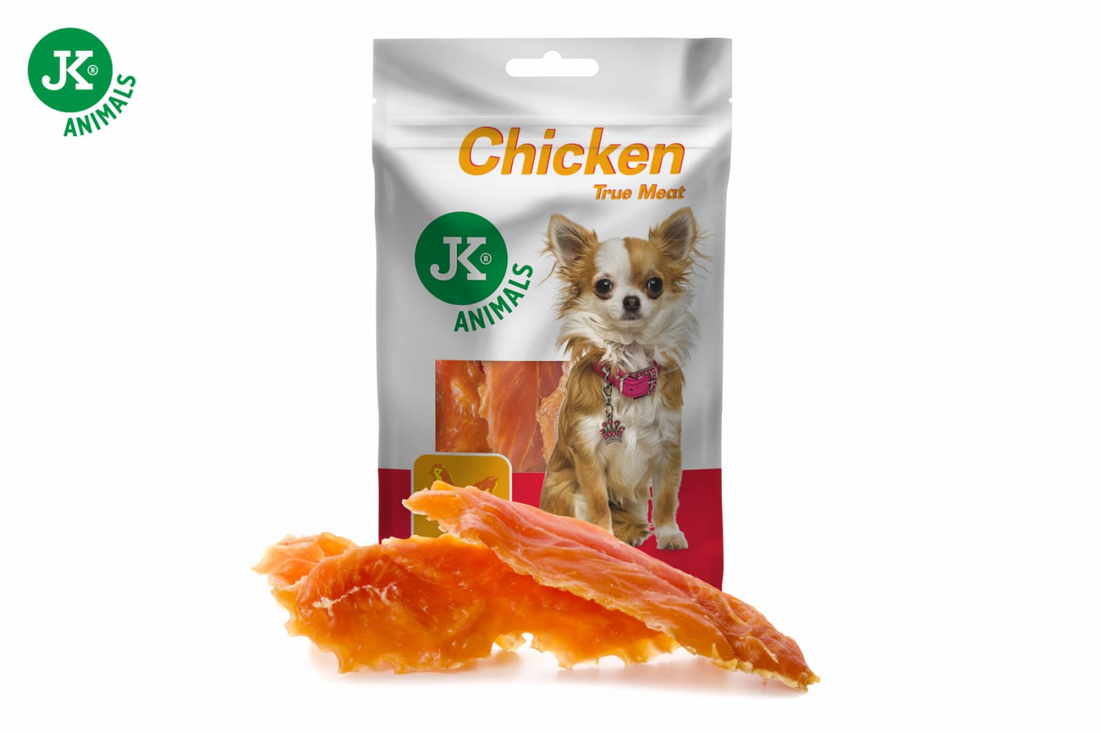 Sušené kuřecí maso pro psy, filety. JK Animals Chicken True Meat Snack 80 g. Doplňkové krmivo pro psy. Vynikající pochoutka pro psy každého věku, slouží jako pamlsek nebo odměna při výcviku. Obj. č. 44960.