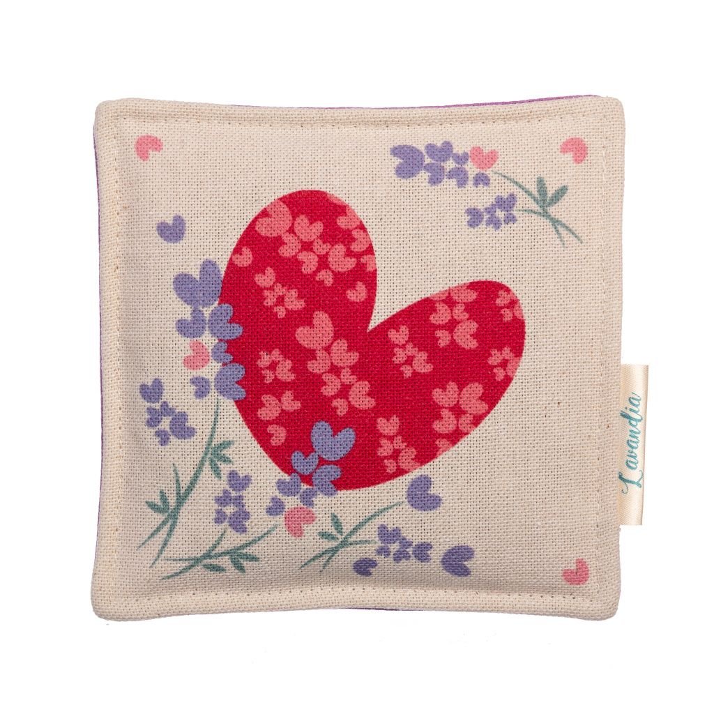 Lavandia Levandulová farma Levandulový podšálek. Aromatický podtácek naplněný květem BIO levandule lékařské na látce z plně recyklované bavlny.Motiv Levandulová srdcovka.