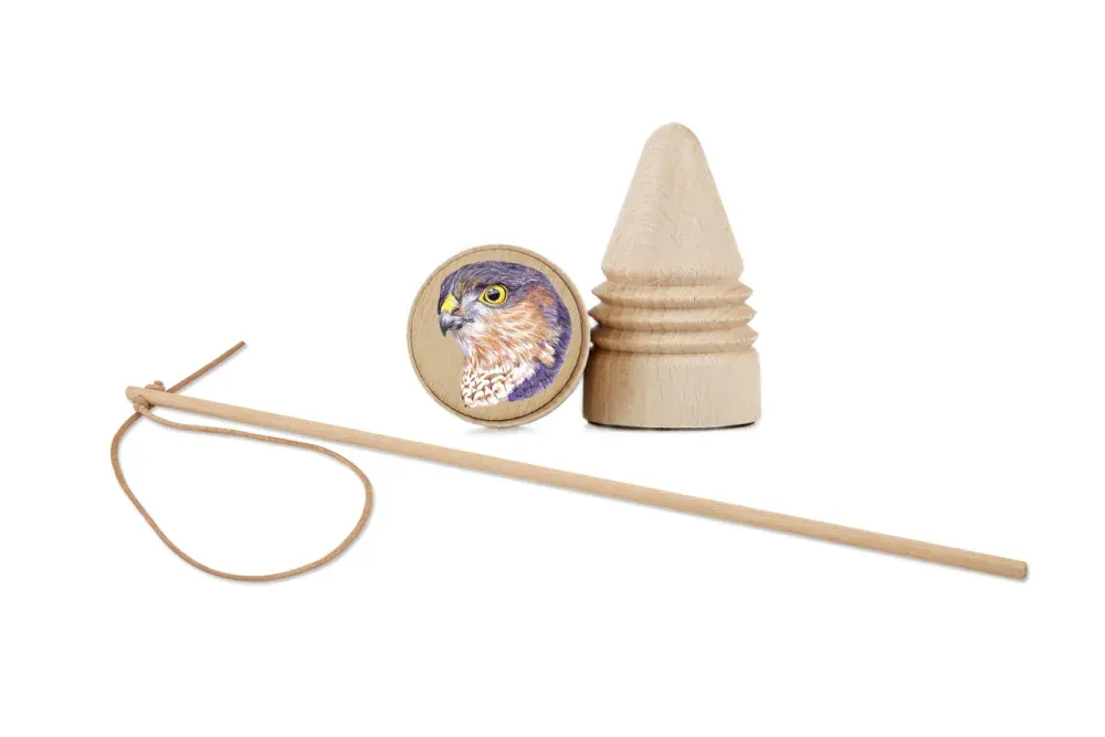 Dřevěná hra pro děti pro trénování zručnosti. Dřevěná káča s bičíkem s motivem Krahujec od českého výrobce Lesní svět. Motorická, venkovní hra pro děti s krásnými lesními motivy. Kód výrobce: 5027-09.