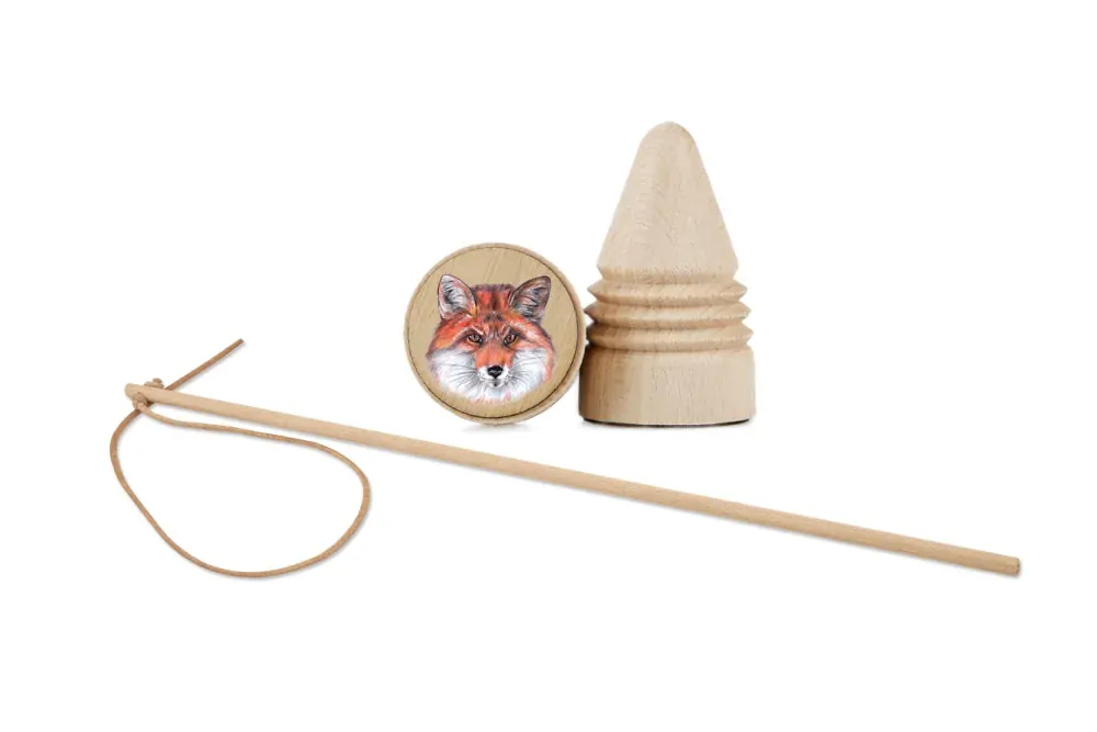 Dřevěná hra pro děti pro trénování zručnosti. Dřevěná káča s bičíkem s motivem Liška od českého výrobce Lesní svět. Motorická, venkovní hra pro děti s krásnými lesními motivy. Kód výrobce: 5027-10.