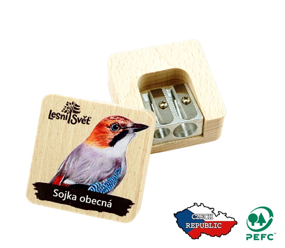 Ručně vyráběné dřevěné ořezávátko na pastelky Lesní svět Sojka obecná - vyrobeno v ČR
