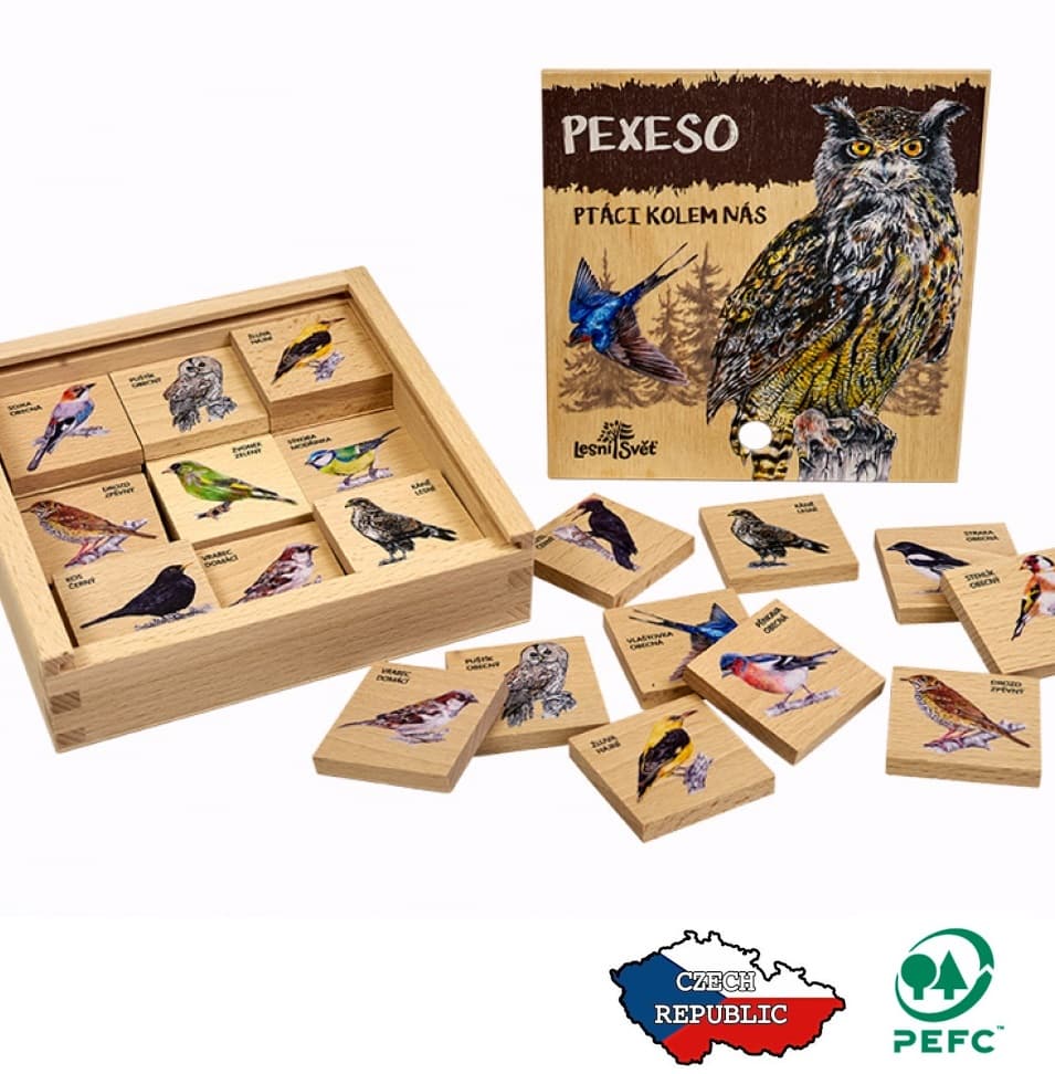 Dřevěné klasické pexeso s motivy našeho ptactva. Edukační pexeso s ekologickým certifikátem od výrobce Lesní svět s českými popiskami nejznámějších ptáčků.