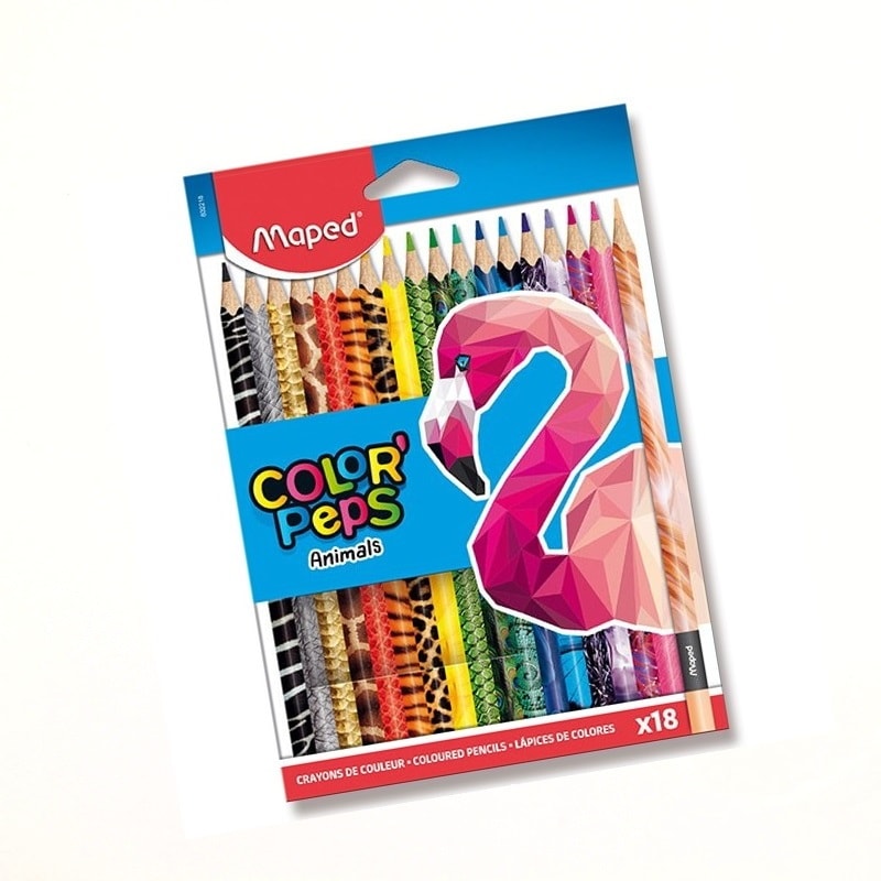 Dřevěné pastelky se zvířecími motivy, trojhranné pastelky Maped Color Peps 0086 18 barev v papírové krabičce, jasné zářivé barvy. Délka pastelky 175 mm, průměr pastelky 7 mm, jádro (tuha) o průměru 2,9 mm. Kód produktu: 122092.