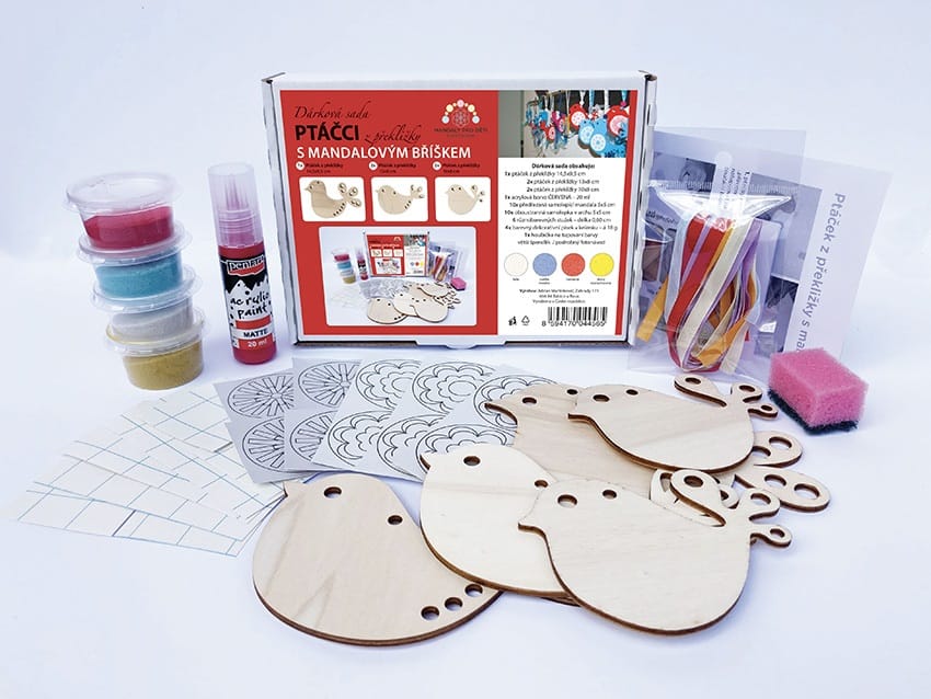 Dárková sada pro kreativní tvoření pro děti - dřevěné výřezy, mandaly z písku a stuhy. Mandaly pro děti Sada Ptáčci z překližky Červená. Kreativní technika pískování obrázků a výřezů k domalování s motivem zvířátek a tvarů pro děti.
