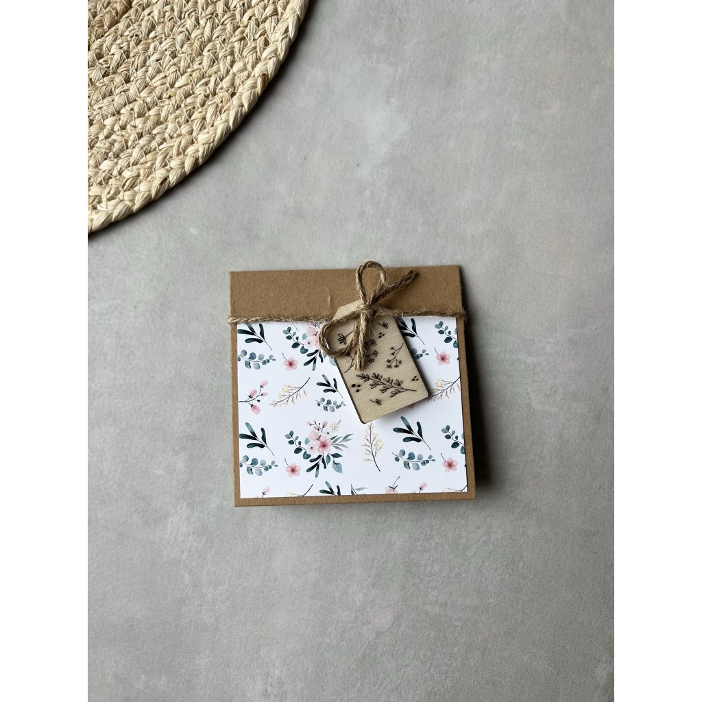 Originální přáníčko se vzorem lučních lístků a dřevěnou visačkou s bílým podkladem uvnitř. Přáníčko udělá radost kamarádce, mamince, kolegyni i tchyni a to k mnoha příležitostem. Katalogové číslo: 1883/S2.