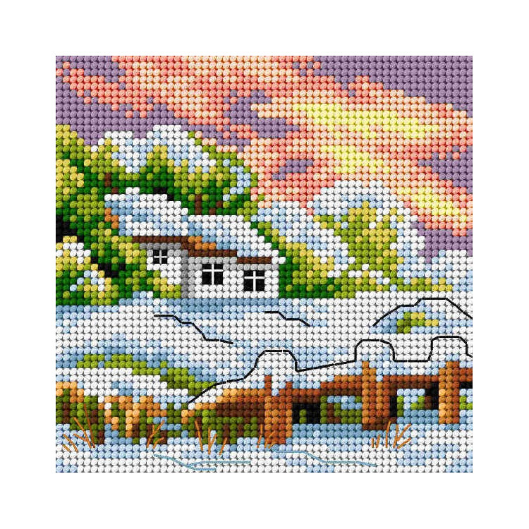 Gobelínové plátno (stramín) s natištěným obrázkem s motivem Domu v zimě. Kreativní předloha od výrobce Orchidea. Bavlněná vyšívací předloha s rozměry 15 x 15 cm. Kód výrobce: 2589.