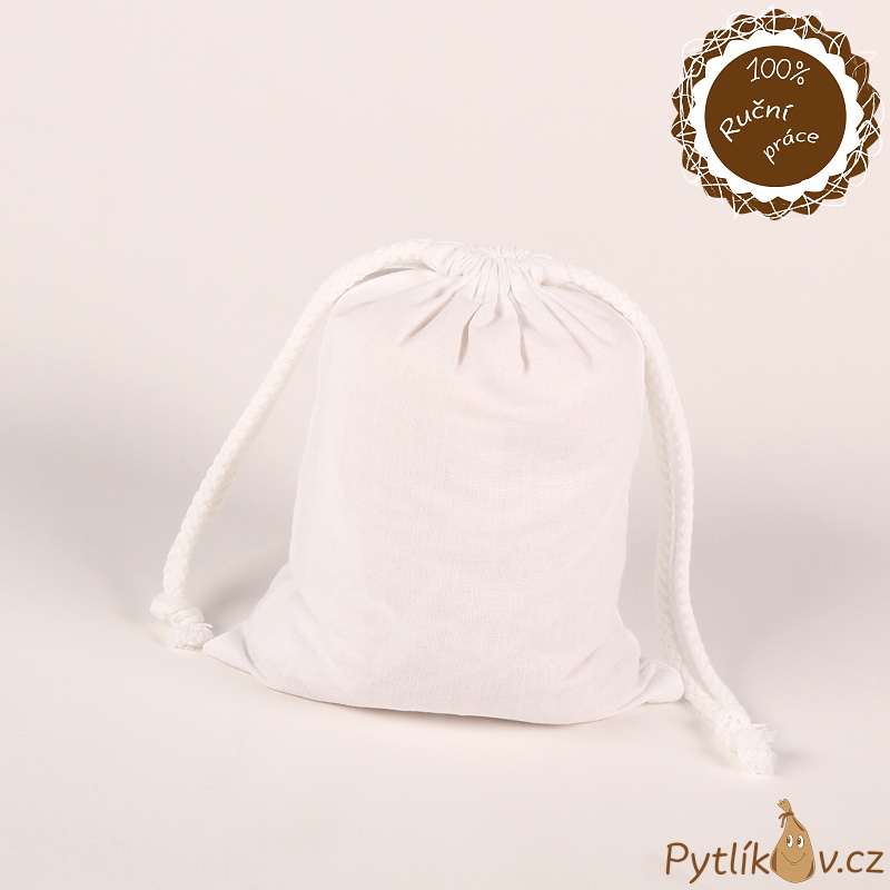 Ručně šitý bíly plátěný pytlík na drobnosti, bylinky, pro děti, hry, jako dárek, nebo kreativní vyžití, jeho další zdobení a dekorace (doporučujeme fixy či barvy na textil). Pytlík je pevně ušitý, není nezničitelný, ale je dobře začištěný i z vnitřní strany, nehrozí tak jeho třepení a příliš rychlé opotřebení. Měl by to být předmět, který bude po nějaký čas sloužit a nebude zatěžovat životní prostředí jako plasty.