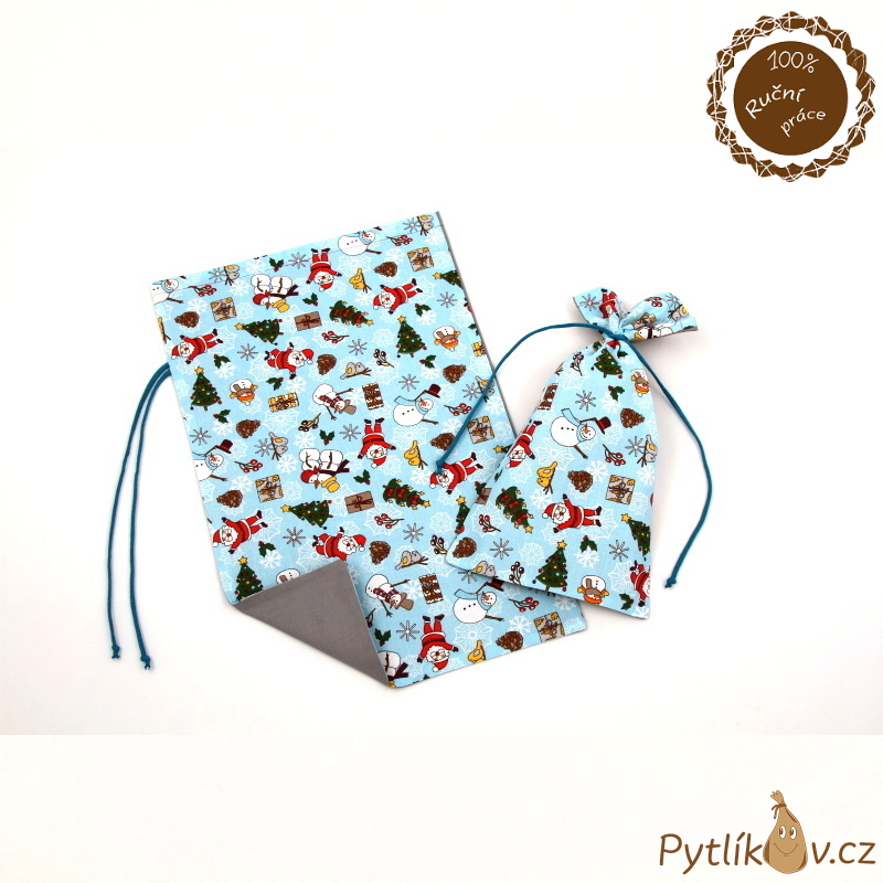 Plátěný pytlík s motivem vánoční sněhuláci na modré, plátěný pytlík na zavázání