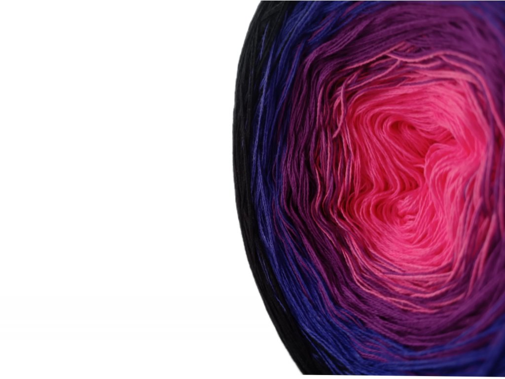 Příze Duhové klubko Butterfly Mini 73. Královna noci, 50% bavlna + 50% akryl. Jemná směsová příze s postupnými barevnými přechody. Klubko je točené z 3 samostatných vláken, nití.