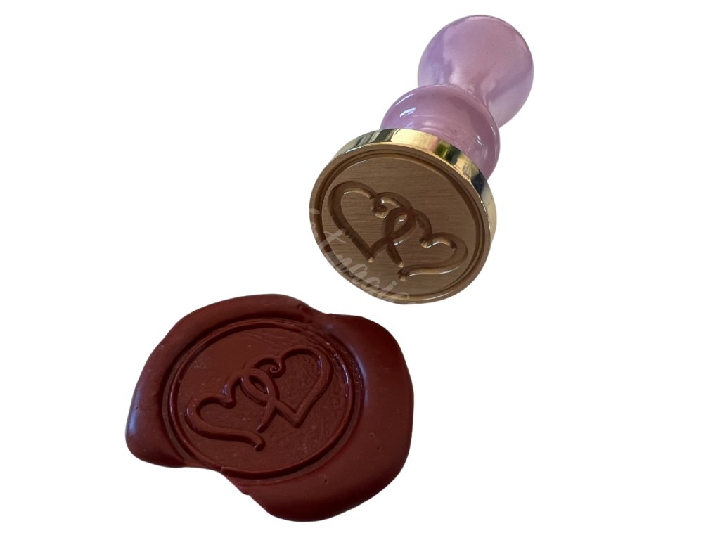 Autorské pečetidlo s motivem dvou srdíček s dřevěnou vyměnitelnou rukojetí, šířka pečetidla 25 mm - mosaz. Kód: ART-346.