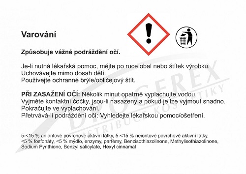 5-15%: aniontových povrchově aktivních látek, neiontové povrchově aktivní látky, <5%: mýdlo, polykarboxylát, fosfonáty, enzymy, vonné látky, optické zjasňovače, benzisothiazolinone, laurylamine dipropylenediamine, sodium pyrithione, butylphenyl methylpropional, citronellol, hexyl cinnamal.
