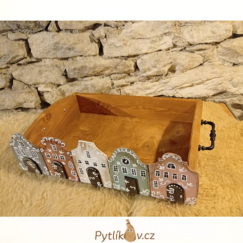 Originální dřevěný servírovací tác na kávu s motivem domečků. Originál od "Veroniky". Rozměry: x cm. Nádherný podnos na potraviny na jídelní stůl s motivy vesnických domečků. Podnos je opatřen uchy na přenášení. Servírovací podnosy ze dřeva od českého výrobce.