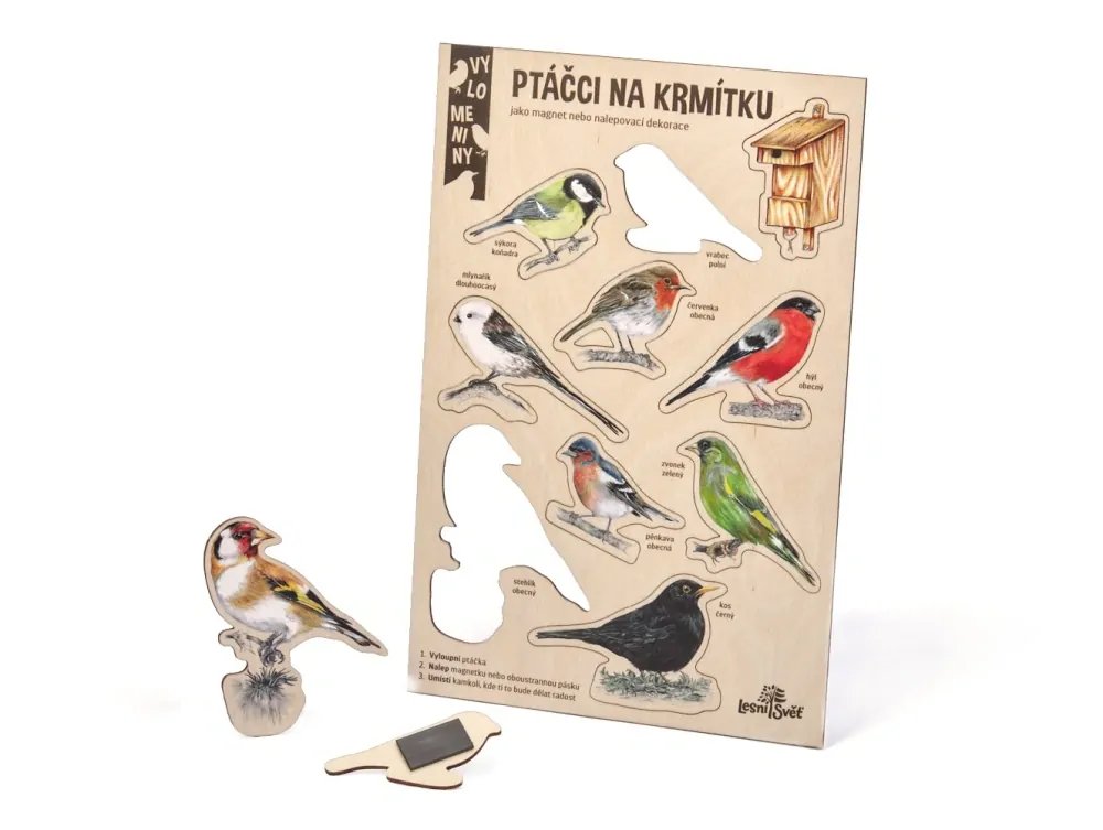 Ručně vyráběné vylamovací magnetky - nálepky pro děti Lesní svět - Ptáčci na krmítku - Sada 8 kusů - vyrobeno v ČR
