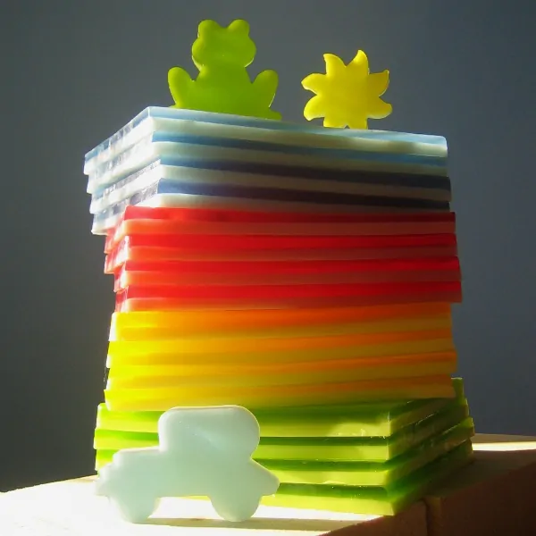 Dvouvrstvá varianta glycerinových mýdlových plátů s obsahem kozího mléka na vykrajování mýdélek pro děti - "rodinná velikost". Jedná se o čtvrtky velkých plátů v různých barvách a vůních dle vašeho výběru.