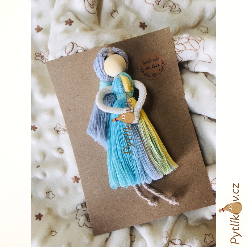 Panenka vyrobená z příze technikou macramé. Ruční výrobek malé české dílny.