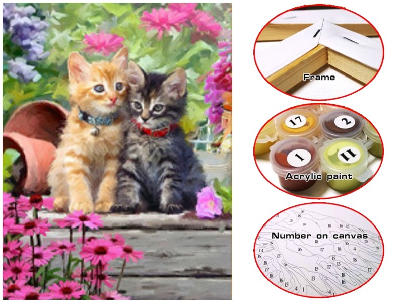 Malování podle čísel, dekorace evokující klid a pohodu na zahradě. Motiv dvou koťátek. Sada obsahuje bavlněné plátno s předkresleným motivem na dřevěném rámu velikosti 30x40cm, sadu 15 akrylových barev a 3 štětce. Obj. č. W2675.