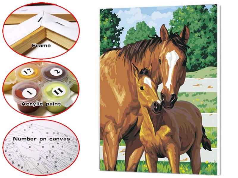 Malování podle čísel. Motiv Koně. Sada obsahuje bavlněné plátno s předkresleným motivem na dřevěném rámu velikosti 40x50cm, sadu 23 akrylových barev a 3 štětce.