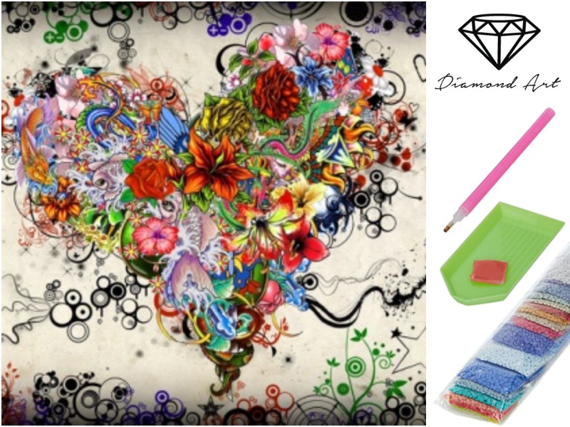 Malování s korálky, lepení obrázků z korálků. Motiv Srdce. Samolepící plátno s předtištěným rastrem pro nalepování korálků, očíslované pytlíčky. Kamínky perem aplikujete na obrázek. Obj. č. 24199 - 8235.
