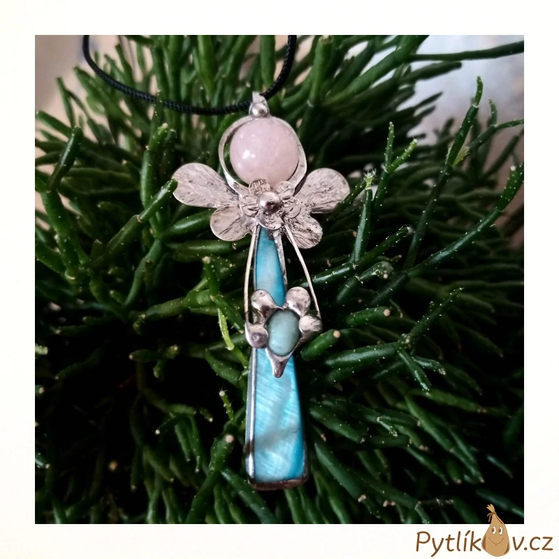 - Náhrdelník ANDĚL z cínu - perleť akvamarín
