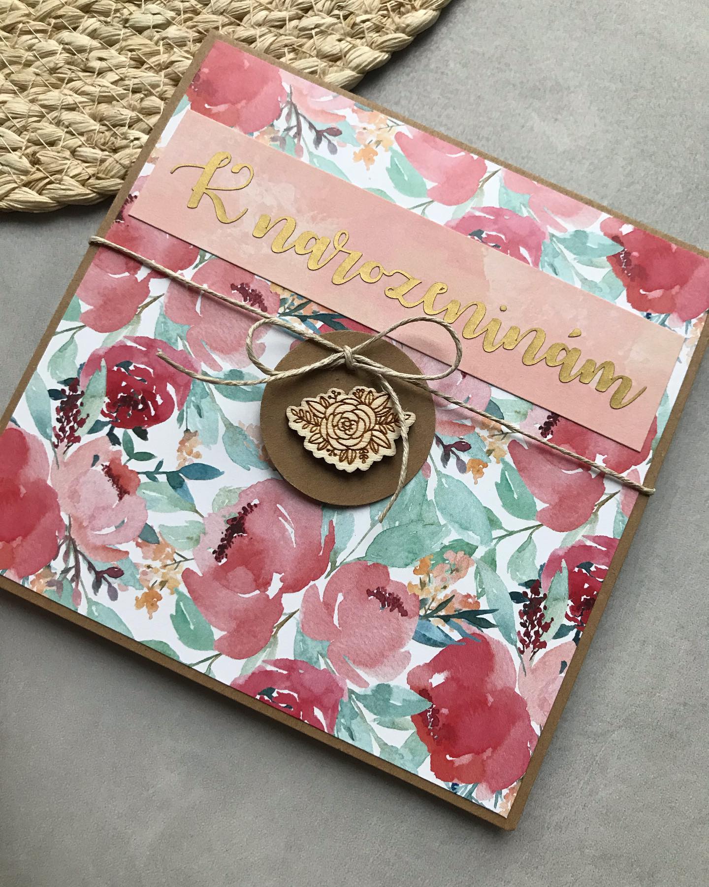 Ručně vyrobené přáníčko s motivy květin a dřevěnou dekorací k narozeninám kamarádky, maminky, babičky, tety. Český výrobek.