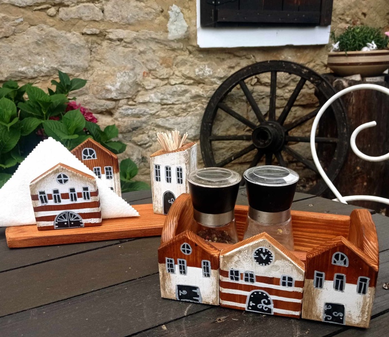 Originální doplněk stolování na ubrousky, koření, nebo příbory i párátka - originální dřevěná dekorace vyrobená v ČR "Originál od Veroniky". Nádherná, dřevěná dekorace na stůlna na zahradě, chalupě i v bytě s motivem domečků, dřevo s impregnací, ručně malované. Každý kus ručně vyrobený a má své jedinečné barvy a provedení. Venku je požití vhodné v závětří, bez přímých povětrnostních vlivů.