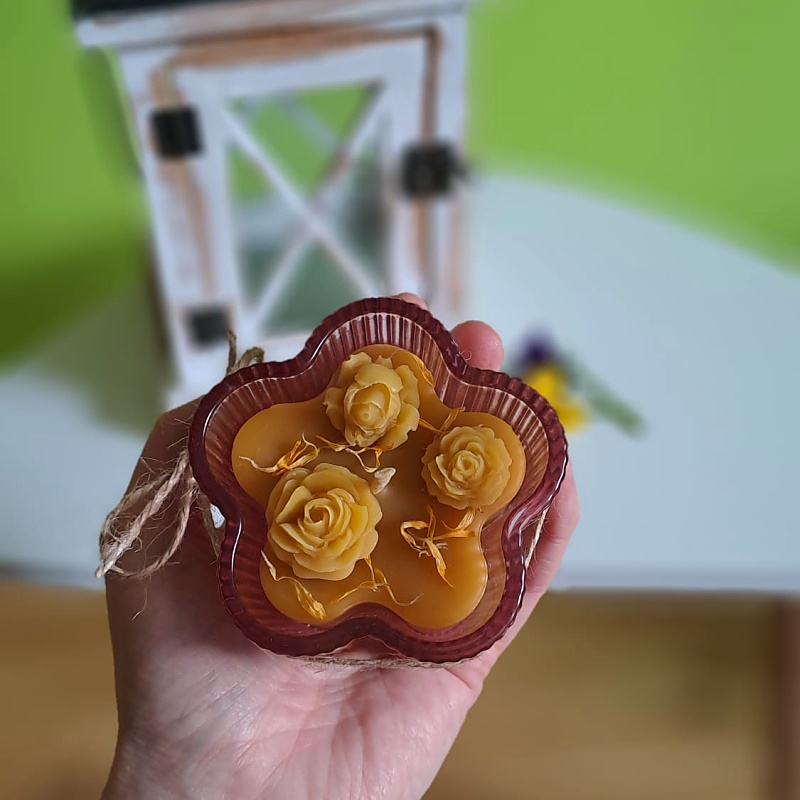 - Svíčka 100% včelí vosk Rozkvetlá louka s květy měsíčku - červená