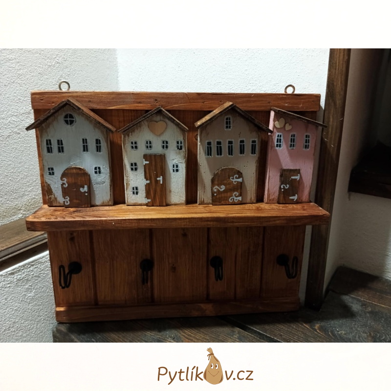 Věšák na klíče - originální dřevěná dekorace vyrobená v ČR "Originál od Veroniky". Nádherná, dřevěná dekorace na zavěšení s motivem domečků, dřevo s impregnací, ručně malované. Každý věšák ručně vyrobený a má své jedinečné barvy a provedení.